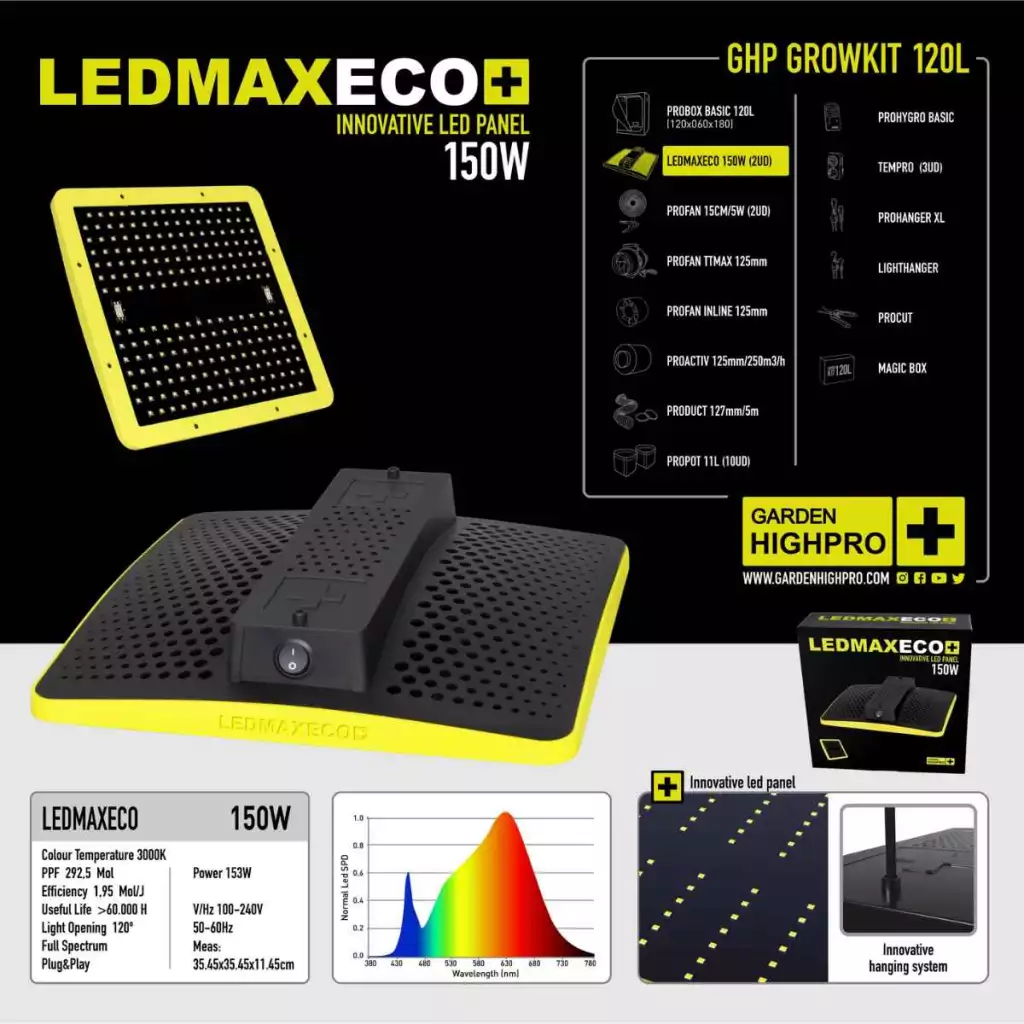 - LEDMAXECO 150W (je 150 Watt, 2 Stück): Diese energieeffizienten LED Growlampen liefent ein erweitertes vollspektrum Licht, ideal für alle Wachstumsphasen deiner Pflanzen.