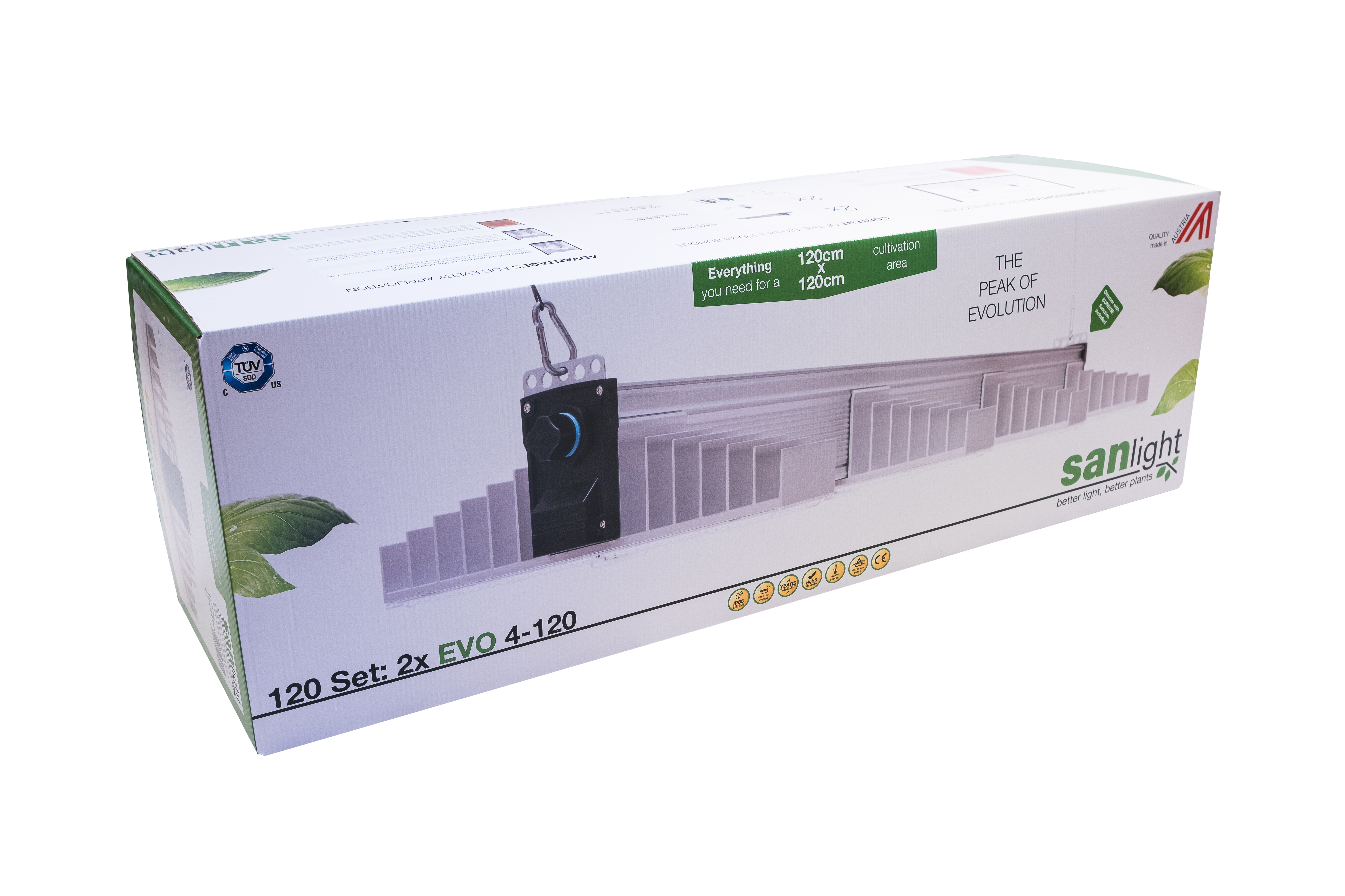 Das Set SANlight LED EVO Set 120×120 – 530W ist für den Indoor-Anbau auf einer Fläche von 120×120 cm gedacht. Das Set enthält 2x LED-Leuchte EVO 4-120 265W (Version 1.5), 1x Stromkabel Typ Y, 2x Seilratsche und 2x Handdimmer. Hohe Effizienz und homogene Lichtverteilung.
